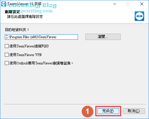Step 3:在進階設定中,可以自行選擇軟體安裝的路徑或使用預設的安裝路徑,然後還有其他的功能,如果你有要使用的話,那就自行勾選,設定完成之後點選『完成』,安裝程式就會開始安裝TeamViewer至你的電腦。