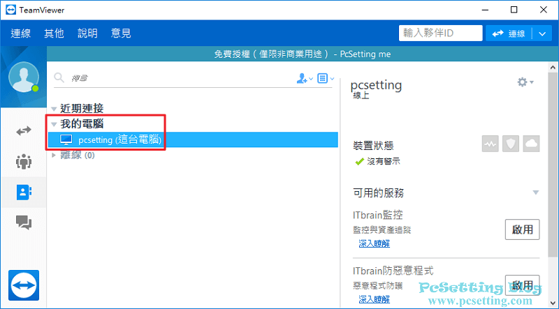 Step 6:如下圖示所示可以看到你已登入TeamViewer帳號,且此部電腦也已加入『我的電腦』清單中。