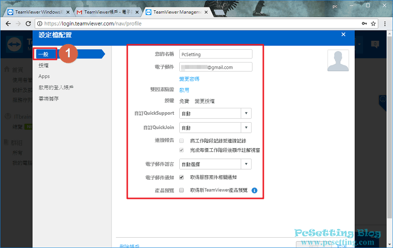 Step 5:如下圖所示在左側『一般』頁籤中,請以自己的需求來選擇及勾選你需要的相關設定,或需要更改你TeamViewer帳號的相關資料,如有變更到帳號的相關設定,要點選右下角的『儲存』,來變更你的設定。另外等下下部分教學會提到的雙因素驗證功能也是在此頁啟用。