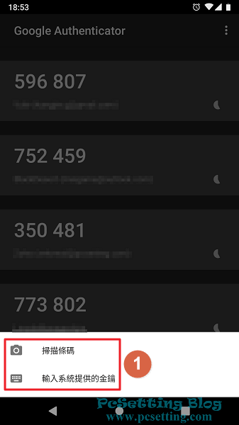 Step 4:如下圖所示在Google Authentication介面中,可以點選右下角的『+』圖示。
