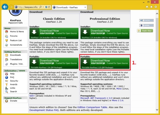 Step 3:KeePass工具提供兩個版本選擇下載,一個是『Classic Edition』,另外一個是『Professional Edition』,這兩者都是免費的,主要差異是『Professional Edition』功能會比『Classic Edition』來的多一些並且可以支援Unicode(萬國碼),而安裝使用『Professional Edition』電腦必須需要.NET Framework 2.0或以上的.NET Framework版本才能執行,如果需要更多詳細KeePass工具兩者版本的差異,可以連結至KeePass Edition Comparison查看。本文教學將使用『Professional Edition』免安裝版本來做教學,如果你需要直接將KeePass工具安裝至電腦請點選下載『Installer』安裝版,如果你不要安裝至電腦,請點選下載如下圖所示的『Portable』免安裝版。