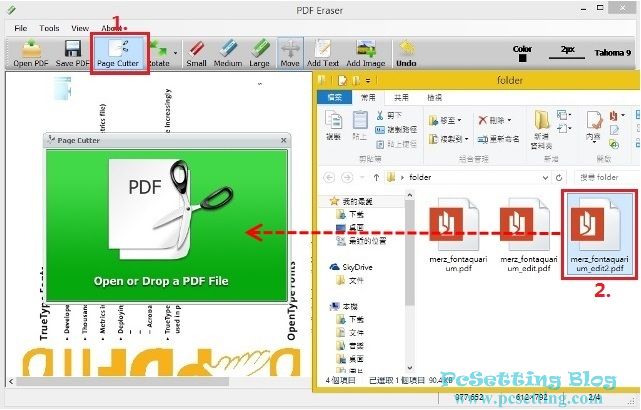 Step 14:如果需要刪除PDF文件裡的某頁,可以點選工具列中的『Page Cutter』,點選『Page Cutter』後會跳出『Page Cutter』新視窗,這很方便,可以進行拖拉方式完成,當然你也可以使用開啟檔案方式來開啟你要的PDF文件。如下圖所示,筆者使用拖拉式來開啟PDF文件。