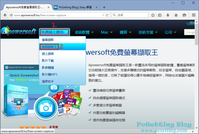 Step 1:Apowersoft也有提供線上螢幕擷取工具,如果使用者有需要,也可以自己試試看,使用上跟螢幕錄影很像,會自動判斷視窗,來擷取你要的區域。