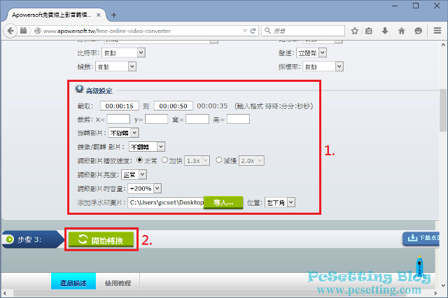 Step 3:Apowersoft影音轉檔線上工具的高級設定,還可以剪輯你所要的影片長度範圍,音量調整與加入浮水印圖片等等的高級設定,使用者可以依自己需求去調整,設定完成後,點擊『開始轉換』按鈕。