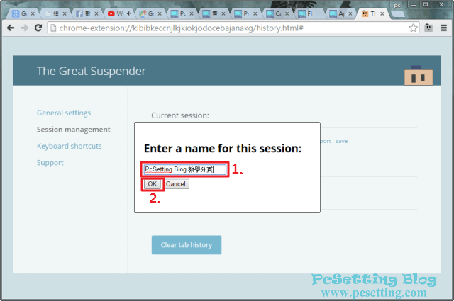 Step 1:The Great Suspende有一個稱為Session management的管理功能,這個功能可以幫助你管理與儲存你目前或最近開啟的分頁記錄,如果你要儲存當前某一個工作階段(session)的所有視窗與分頁記錄,以方便日後可以一次大量開啟你儲存的某一個工作階段中的所有視窗與分頁,就要好好利用此功能了,如下圖所示筆者點選『save』想要儲存當前的工作階段的記錄。