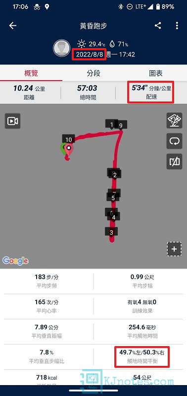 術後滿一年後,有跑了一場10公里,如下圖所示可以看到配速每公里可以在5分速了。