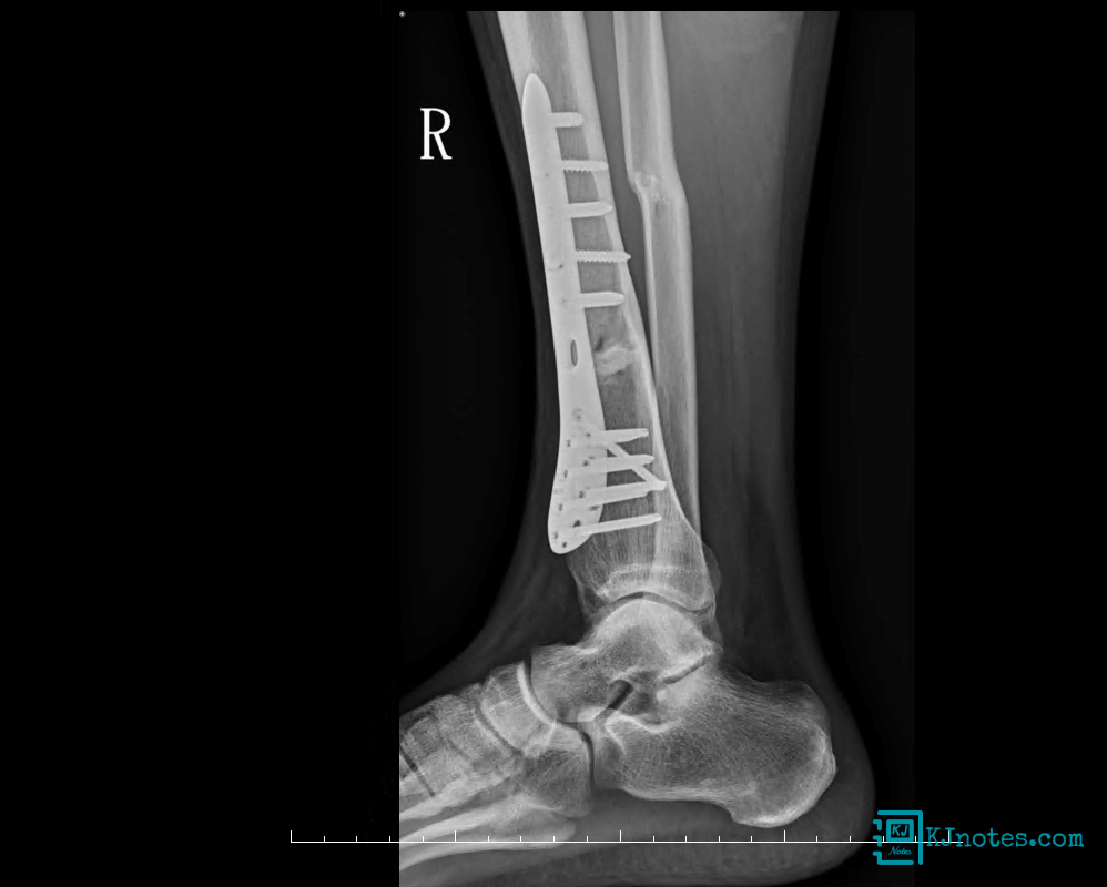 到了12月初,終於要面對鋼釘鋼板取出手術,在手術前一天就住院檢查身體狀況,比如照X光、抽血和心電圖的檢查,手術當日,跟骨折當日手術一樣全身麻醉,過程很順利,手術當日一樣要仰賴拐杖行走,但隔日早上就可以直接放掉拐杖直接行走了,不再依賴拐杖,並且開刀完隔日醫師允許下就出院了,約兩週再回診拆線,這期間手術傷口不要碰水,以免感染,下圖為手術完成當日拍的X光照。另外,醫師有吩咐約一個月不要做激烈運動。術後傷口癒合很快,約兩週多就可以碰水不用像之前一樣防水了,這期間主要注意一件事就是,術後的傷口每週要換美容膠帶貼,約要用三個月左右,讓傷口可以平整癒合,減少疤痕。