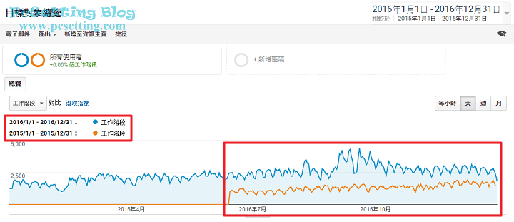 筆者這邊設定就以2016/6/15日開始至2016/12/31日與前年2015/6/15日開始至2015/12/31日這期間來做比較,如下圖所示可以看到本站有很明顯的成長,基本上有看到綠色的%數,就可以比較放心了,希望明年流量可以有更好的突破性成長。