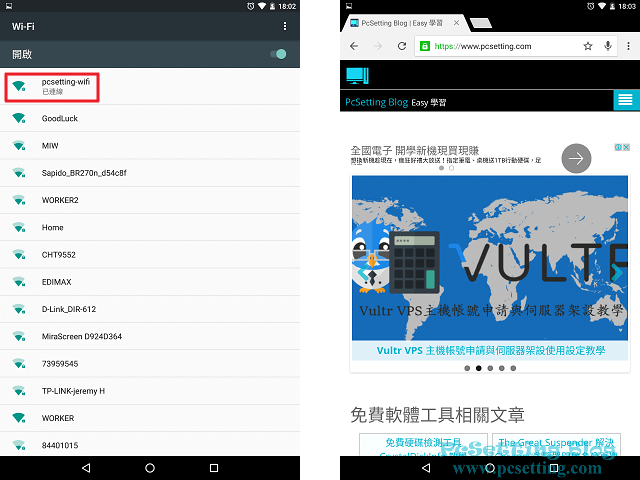 Step 6:開啟你筆電的行動熱點功能後,接下來就可以使用無線裝置來連線至你的筆電,如下圖所示筆者使用Android裝置來連線至網路的過程。